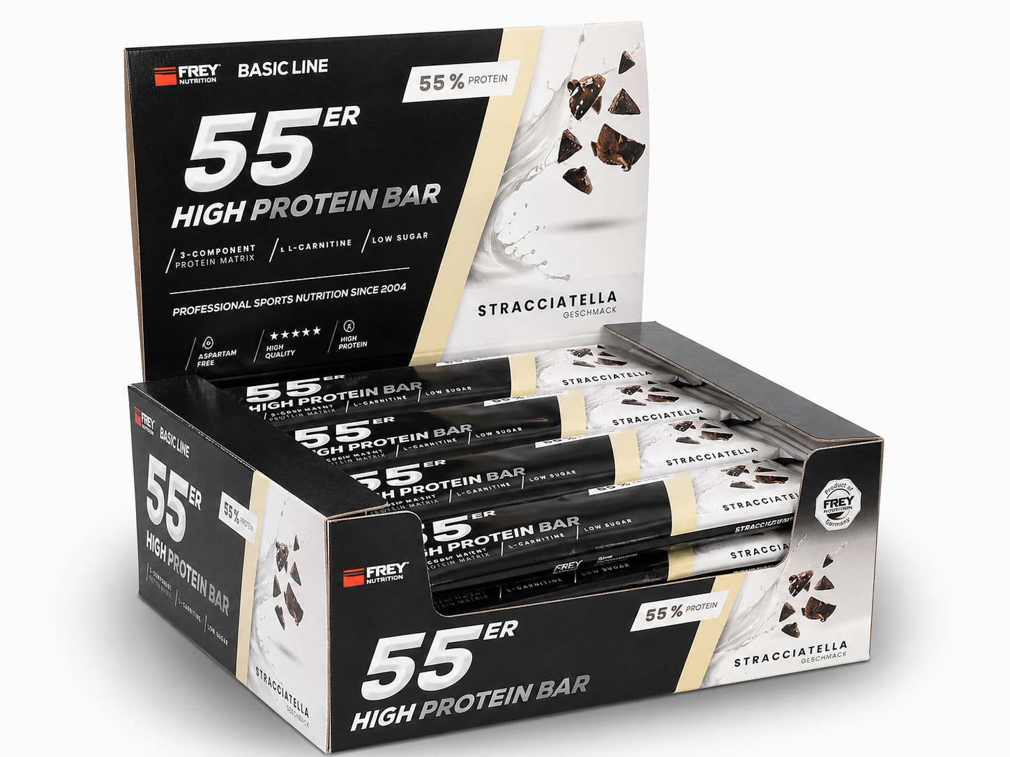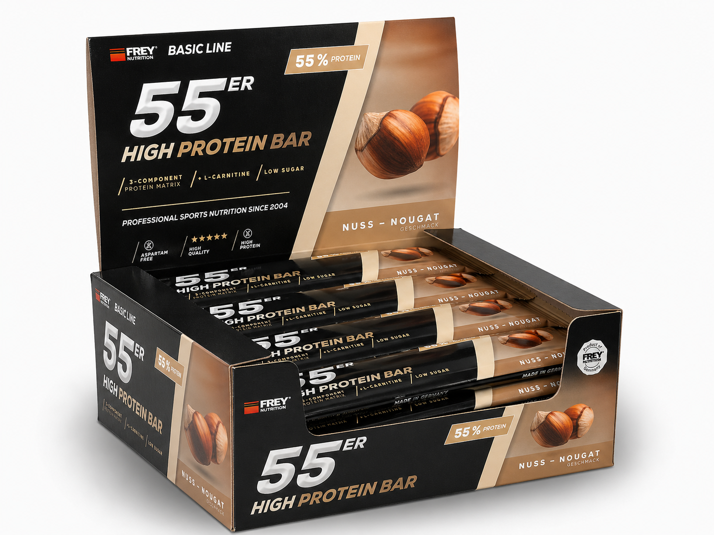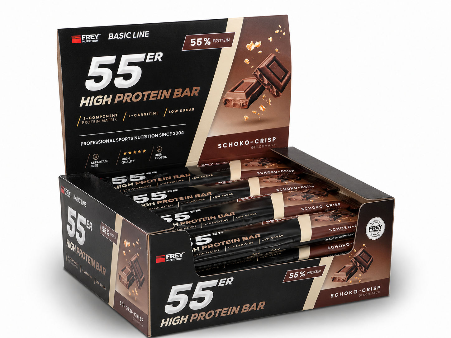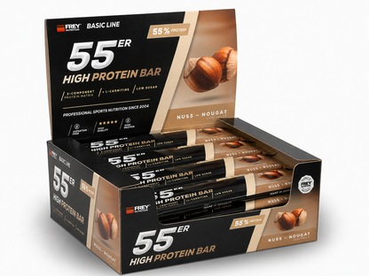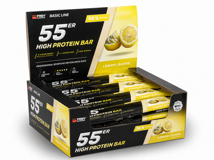 Der 55er ist die neueste Revolution in der Riegel-Forschung und vereint als Mehrkomponenten-Proteinriegel hochwertige Zutaten, einen hohen Proteingehalt und einen geringen Zuckeranteil mit einem einmalig leckeren Geschmack. Im 55er kommen nicht nur ernährungsphysiologisch sinnvolle Zutaten zum Einsatz, sondern gleichfalls hochwertige Proteinkomponenten mit Verzicht auf künstliche Vitaminzusätze. So erzielt die enthaltene Proteinmatrix aus Milch-, Molken- und Sojaprotein-Isolat nicht nur einen unglaublich hohen Proteingehalt von bis zu 55 %, sondern auch eine außerordentliche biologische Wertigkeit von 126. Der 55er enthält pro Riegel weniger als 1 g netto Kohlenhydrate (net carbs) und ist besonders für eine kohlenhydratreduzierte Ernährung geeignet. Ob nach dem Training, für Zwischendurch oder als leckere Nascherei ohne schlechtes Gewissen, der 55er ist zu jeder Zeit geeignet, indem er für einen zuckerarmen und eiweißreichen Proteinschub sorgt!