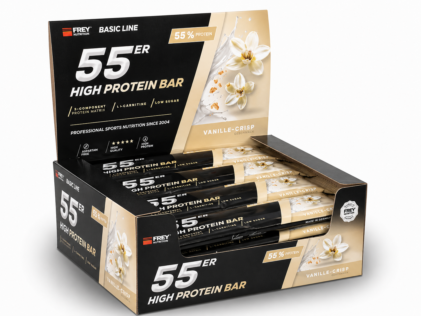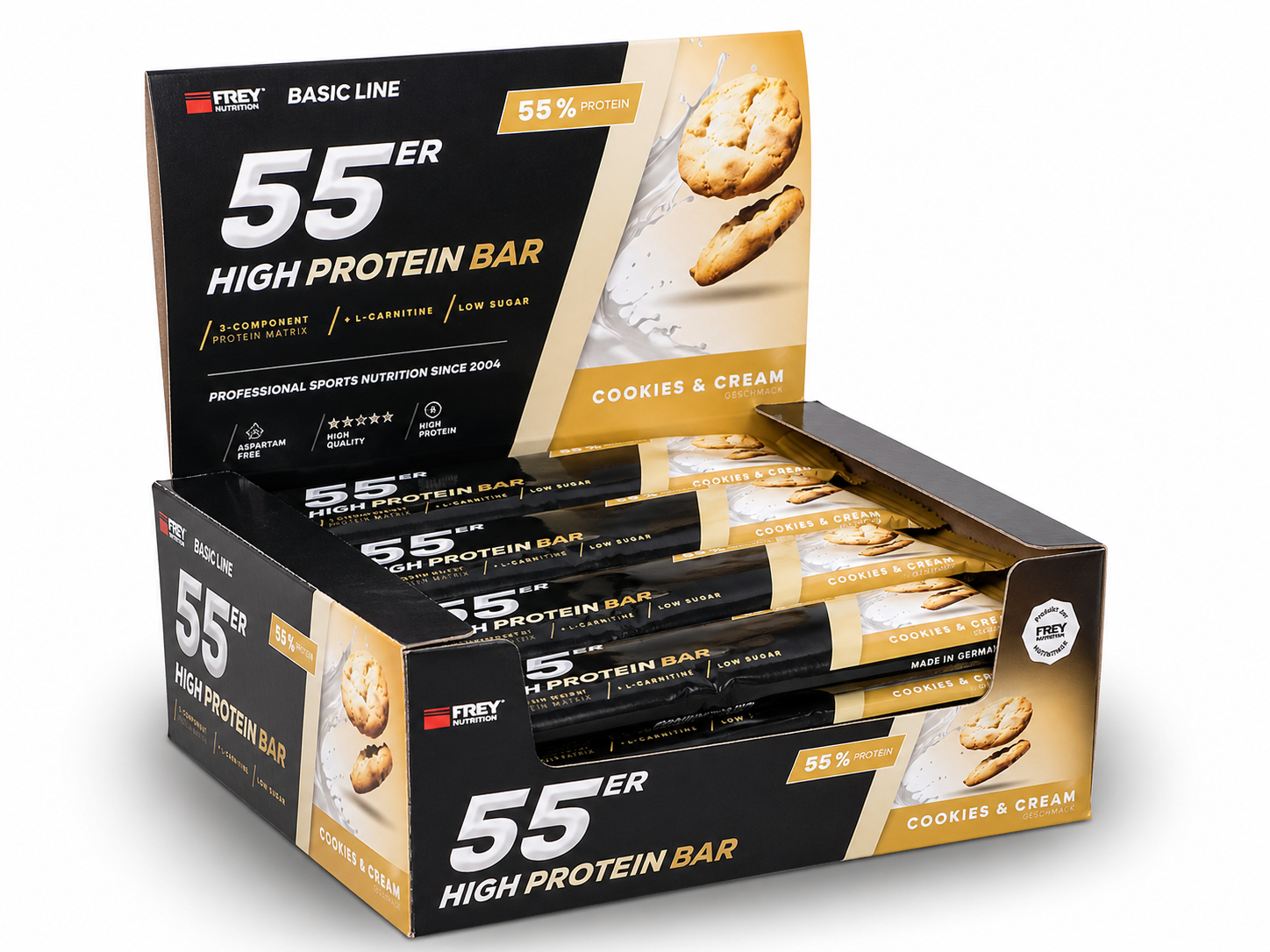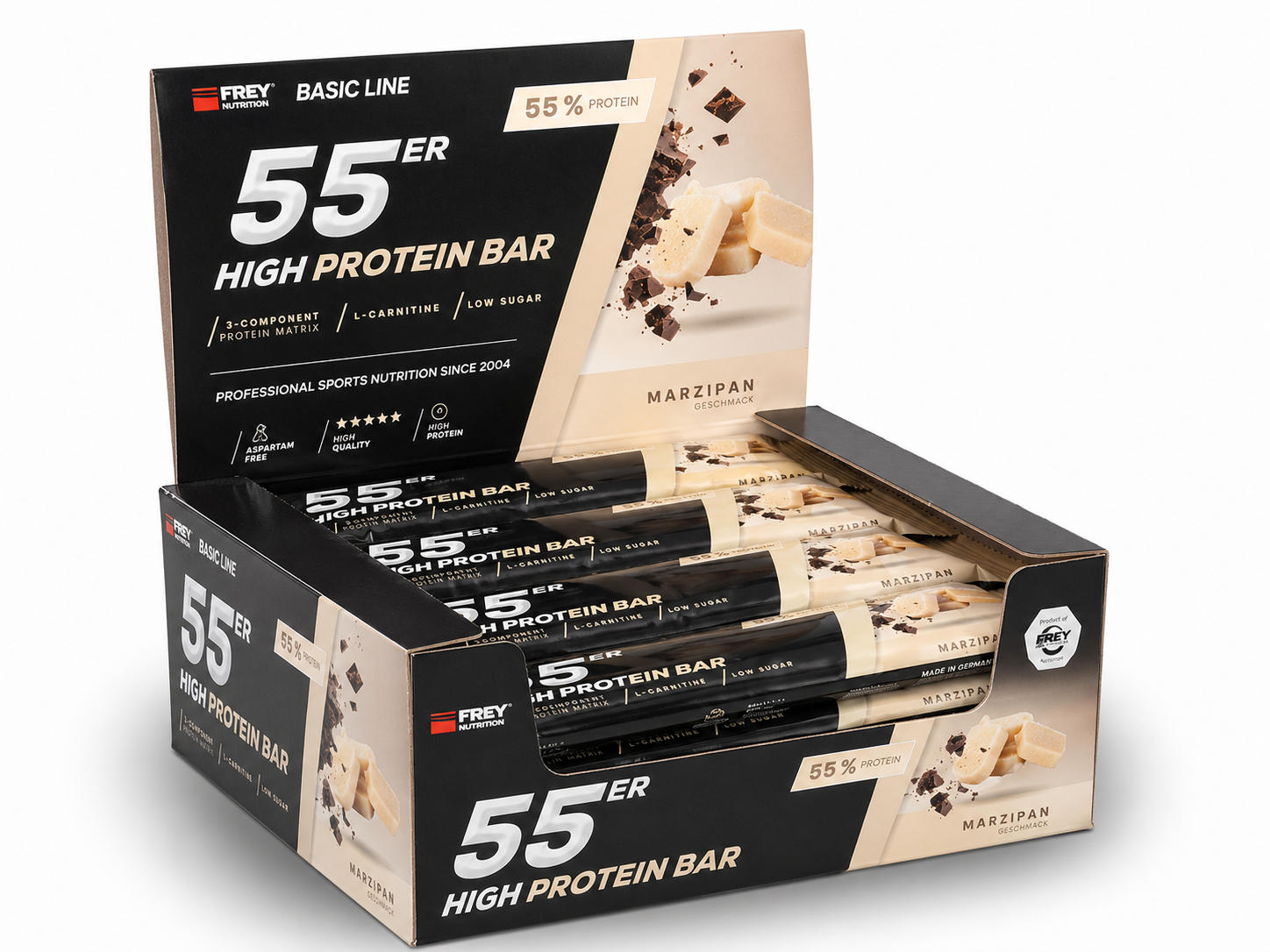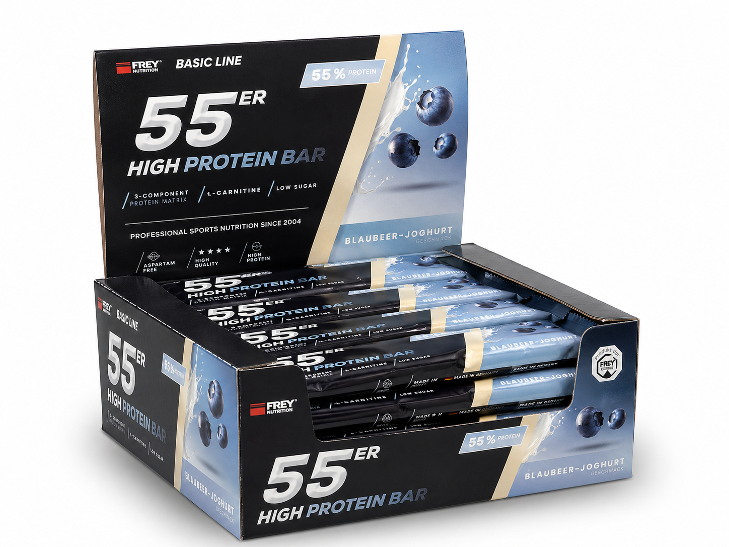 Der 55er ist die neueste Revolution in der Riegel-Forschung und vereint als Mehrkomponenten-Proteinriegel hochwertige Zutaten, einen hohen Proteingehalt und einen geringen Zuckeranteil mit einem einmalig leckeren Geschmack. Im 55er kommen nicht nur ernährungsphysiologisch sinnvolle Zutaten zum Einsatz, sondern gleichfalls hochwertige Proteinkomponenten mit Verzicht auf künstliche Vitaminzusätze. So erzielt die enthaltene Proteinmatrix aus Milch-, Molken- und Sojaprotein-Isolat nicht nur einen unglaublich hohen Proteingehalt von bis zu 55 %, sondern auch eine außerordentliche biologische Wertigkeit von 126. Der 55er enthält pro Riegel weniger als 1 g netto Kohlenhydrate (net carbs) und ist besonders für eine kohlenhydratreduzierte Ernährung geeignet. Ob nach dem Training, für Zwischendurch oder als leckere Nascherei ohne schlechtes Gewissen, der 55er ist zu jeder Zeit geeignet, indem er für einen zuckerarmen und eiweißreichen Proteinschub sorgt!