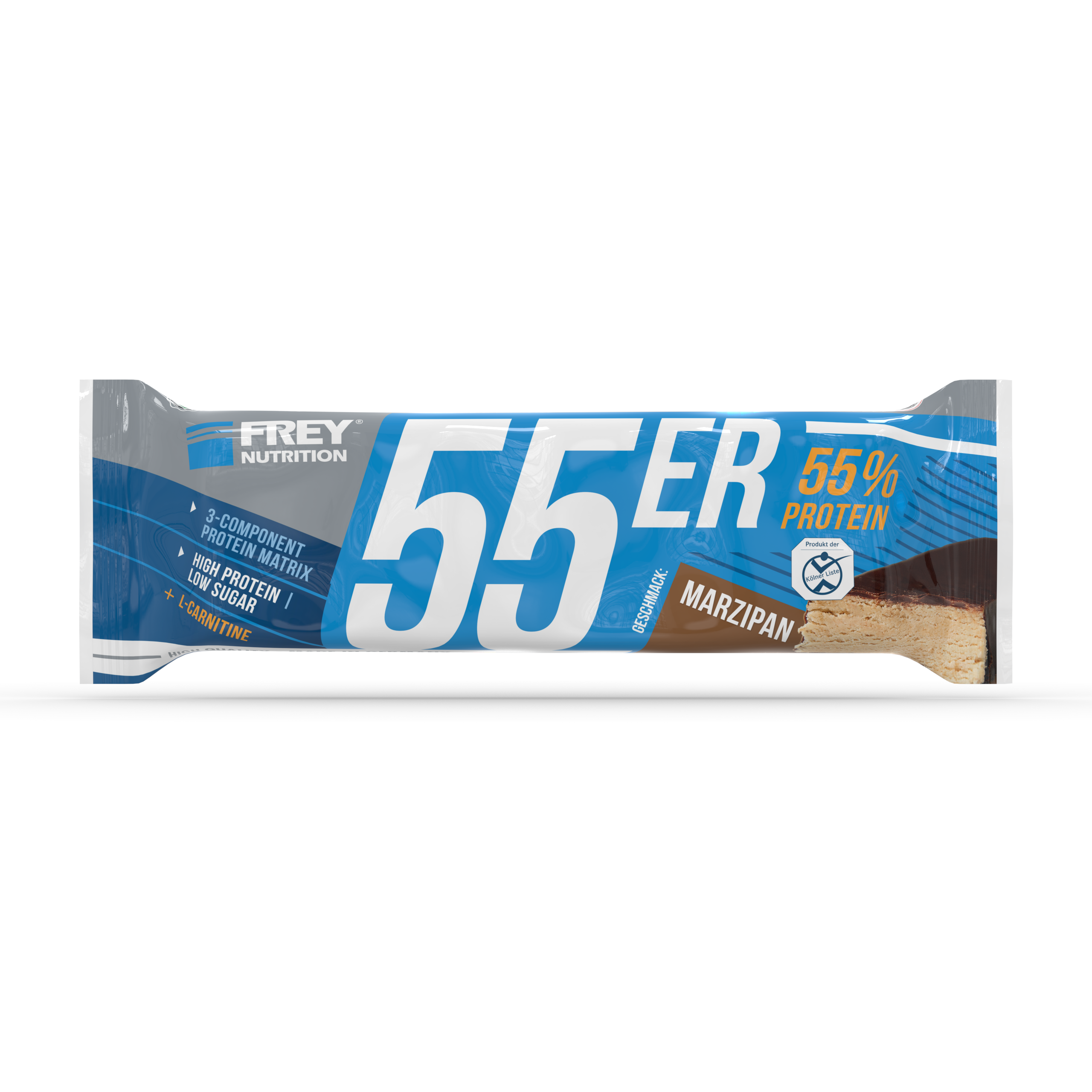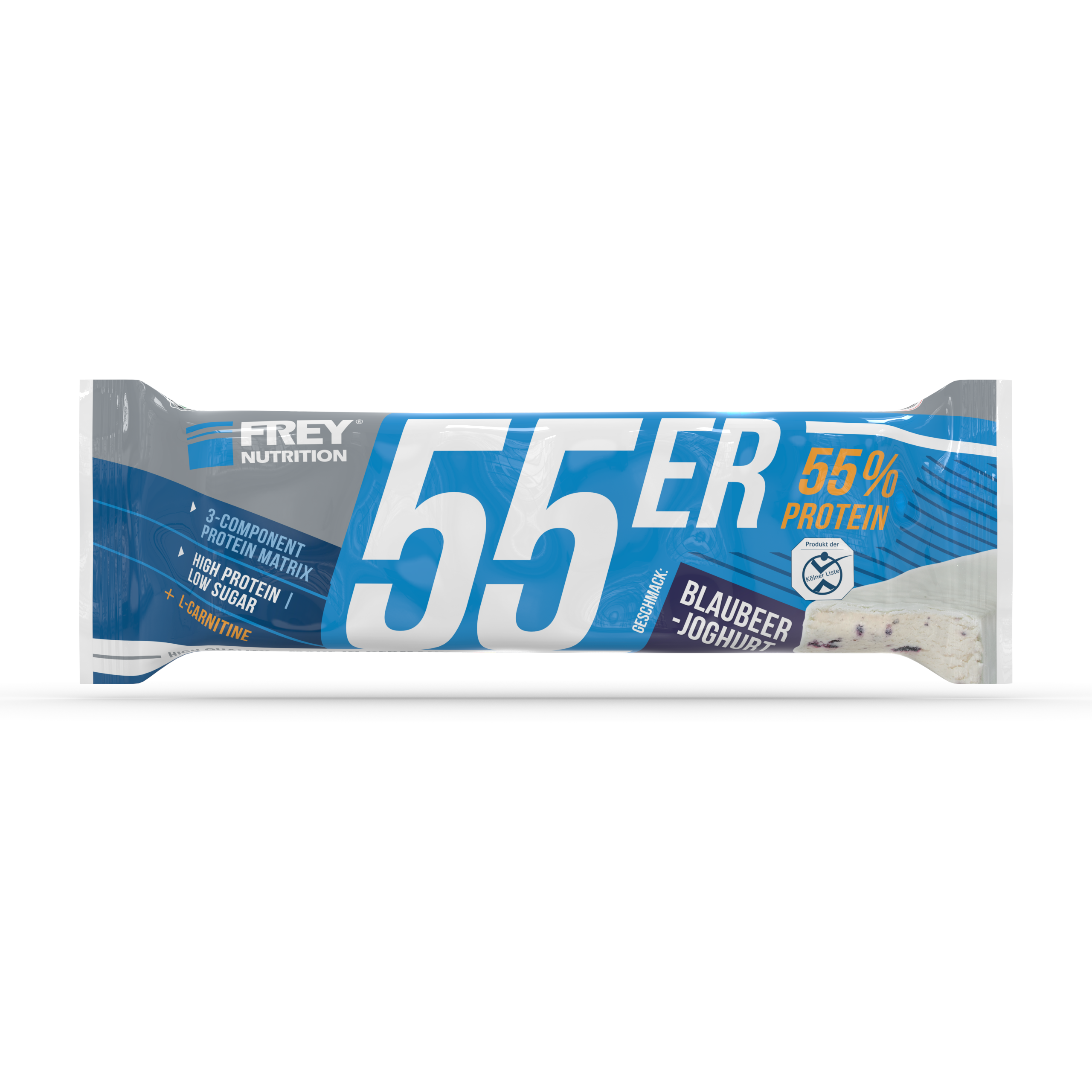 Der 55er ist die neueste Revolution in der Riegel-Forschung und vereint als Mehrkomponenten-Proteinriegel hochwertige Zutaten, einen hohen Proteingehalt und einen geringen Zuckeranteil mit einem einmalig leckeren Geschmack. Im 55er kommen nicht nur ernährungsphysiologisch sinnvolle Zutaten zum Einsatz, sondern gleichfalls hochwertige Proteinkomponenten mit Verzicht auf künstliche Vitaminzusätze. So erzielt die enthaltene Proteinmatrix aus Milch-, Molken- und Sojaprotein-Isolat nicht nur einen unglaublich hohen Proteingehalt von bis zu 55 %, sondern auch eine außerordentliche biologische Wertigkeit von 126. Der 55er enthält pro Riegel weniger als 1 g netto Kohlenhydrate (net carbs) und ist besonders für eine kohlenhydratreduzierte Ernährung geeignet. Ob nach dem Training, für Zwischendurch oder als leckere Nascherei ohne schlechtes Gewissen, der 55er ist zu jeder Zeit geeignet, indem er für einen zuckerarmen und eiweißreichen Proteinschub sorgt!
