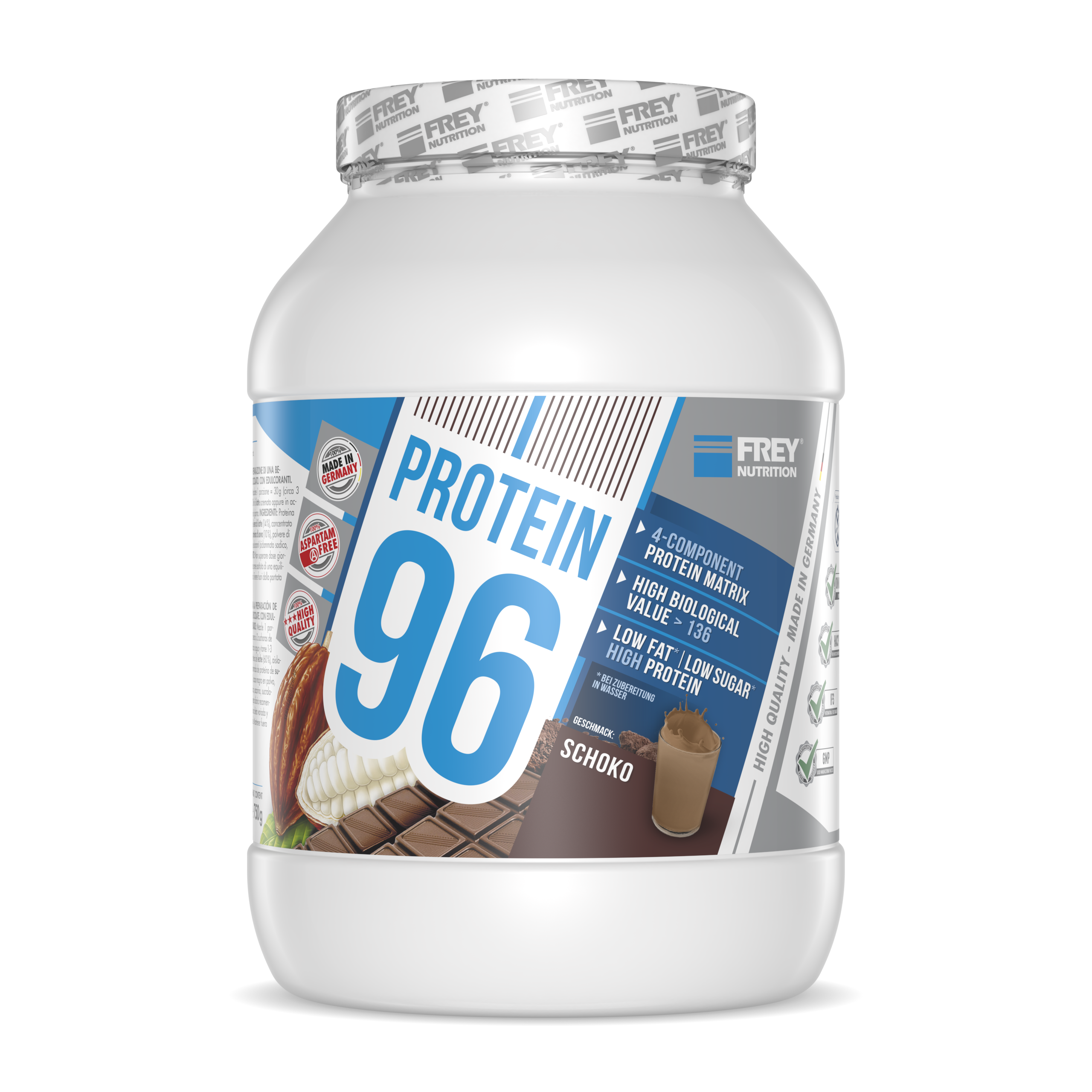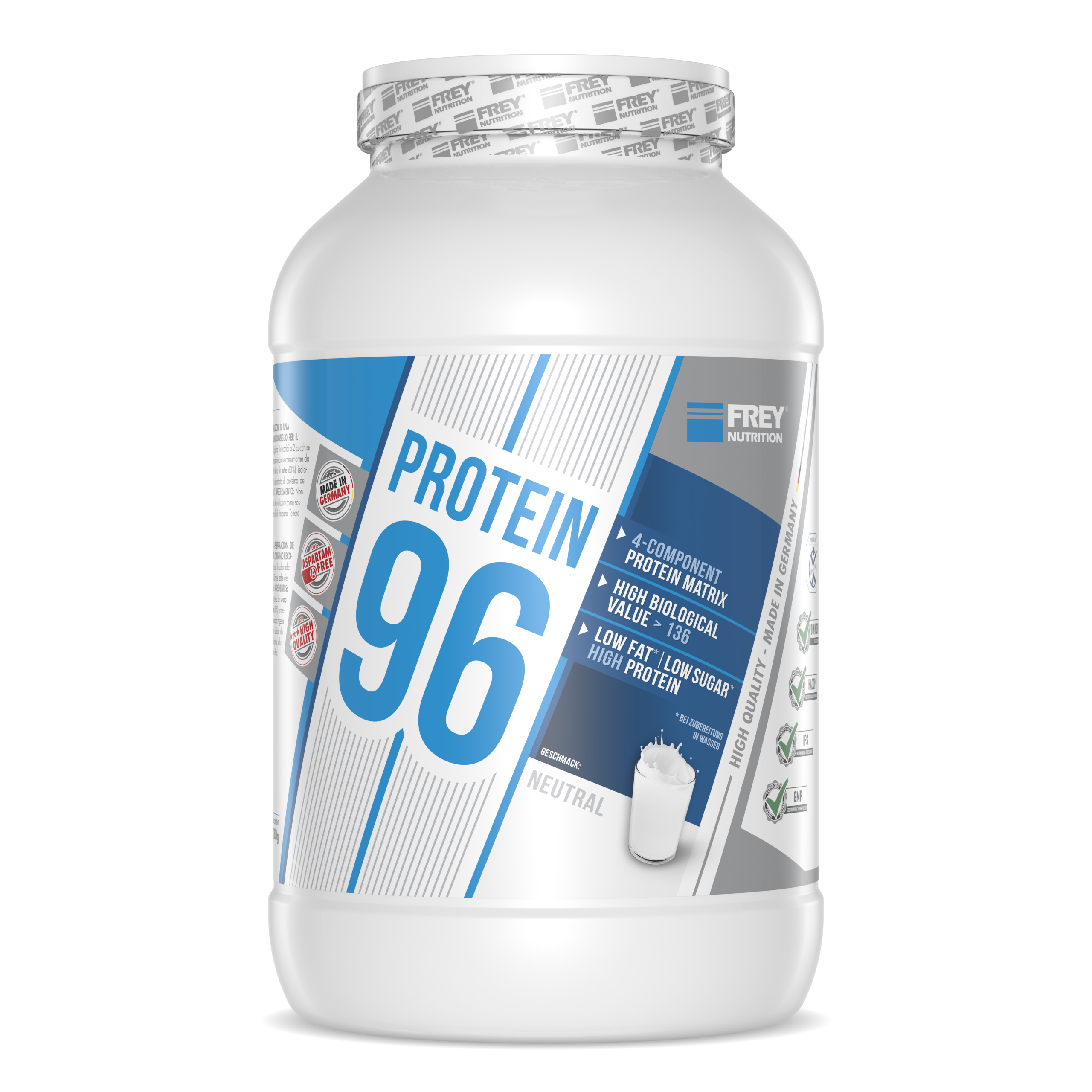 • PROTEIN 96 ist ein 4-Komponenten-Protein der neuesten Generation. Durch die verschiedenen Proteinkomponenten (Milchprotein, Molkenprotein-Isolat, Molkenprotein-Konzentrat und Eiprotein) erreicht es eine hohe biologische Wertigkeit von über 136. Der durchschnittliche Proteingehalt liegt bei 96 % (i. Tr.). Durch den hohen Proteinanteil trägt PROTEIN 96 zum Aufbau und Erhalt von Muskelmasse bei und ist das ideale Protein für Diätphasen. Es schmeckt hervorragend mit Milch und auch mit Wasser - da es auf Wasserbasis entwickelt wurde - und lässt sich leicht (ohne Mixer) zubereiten.