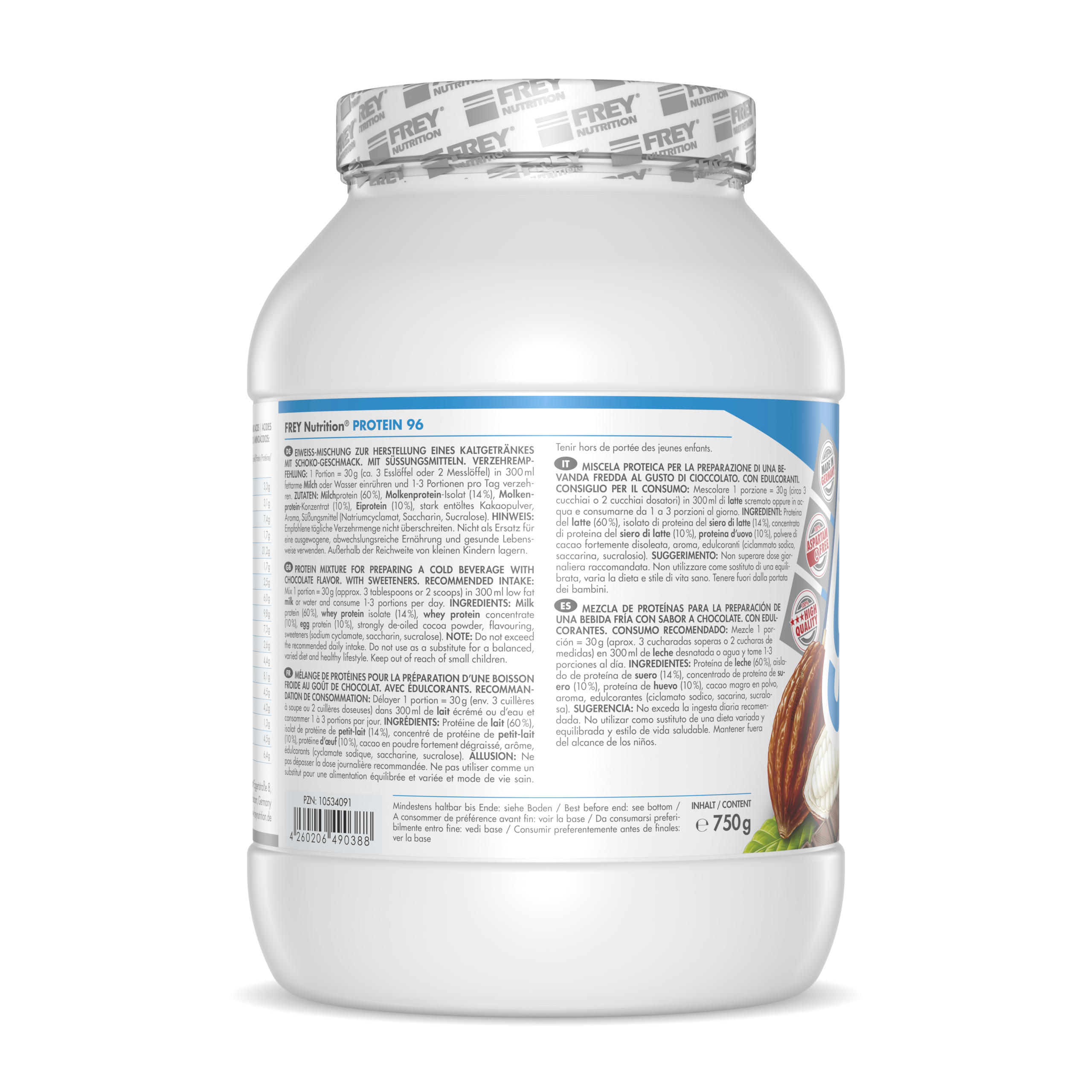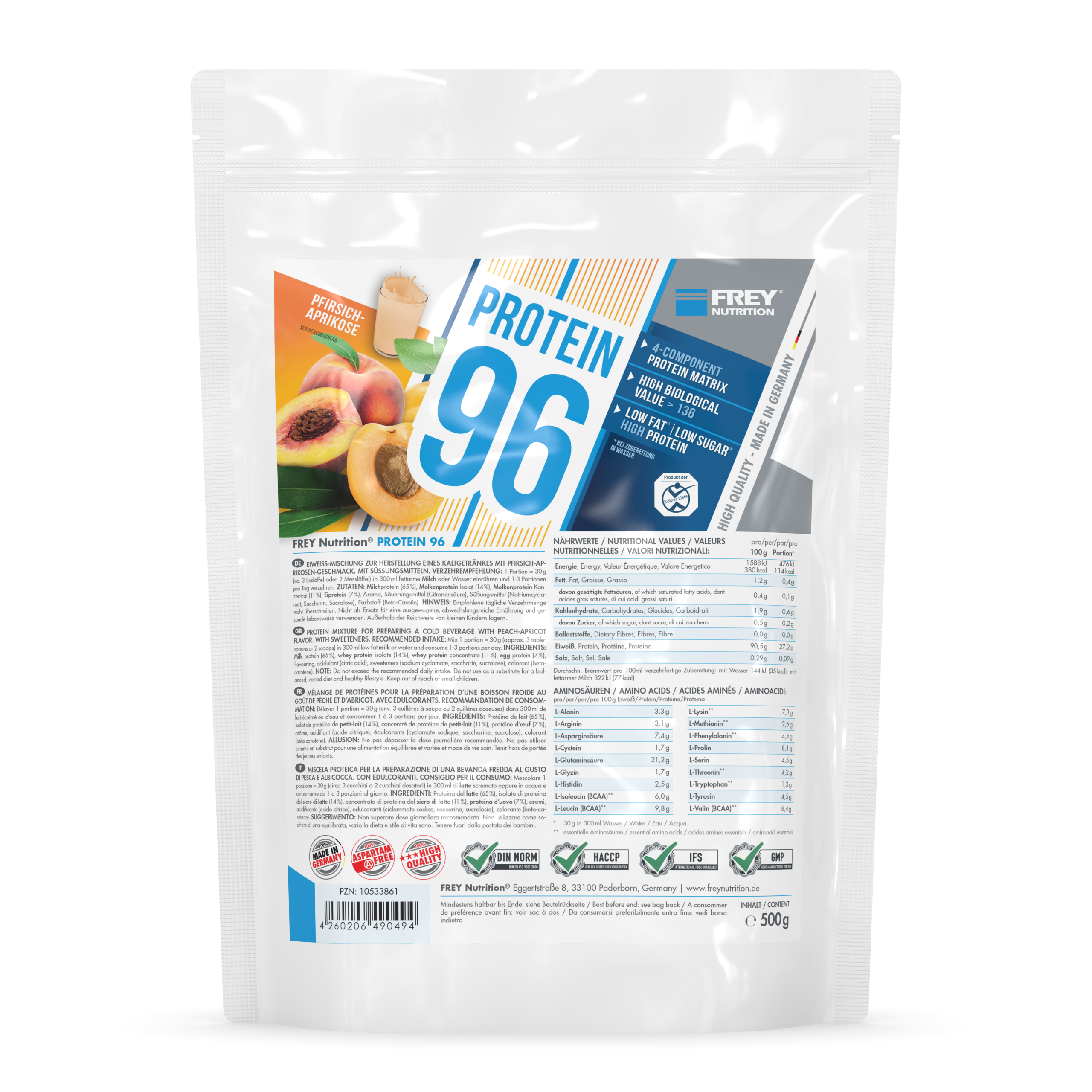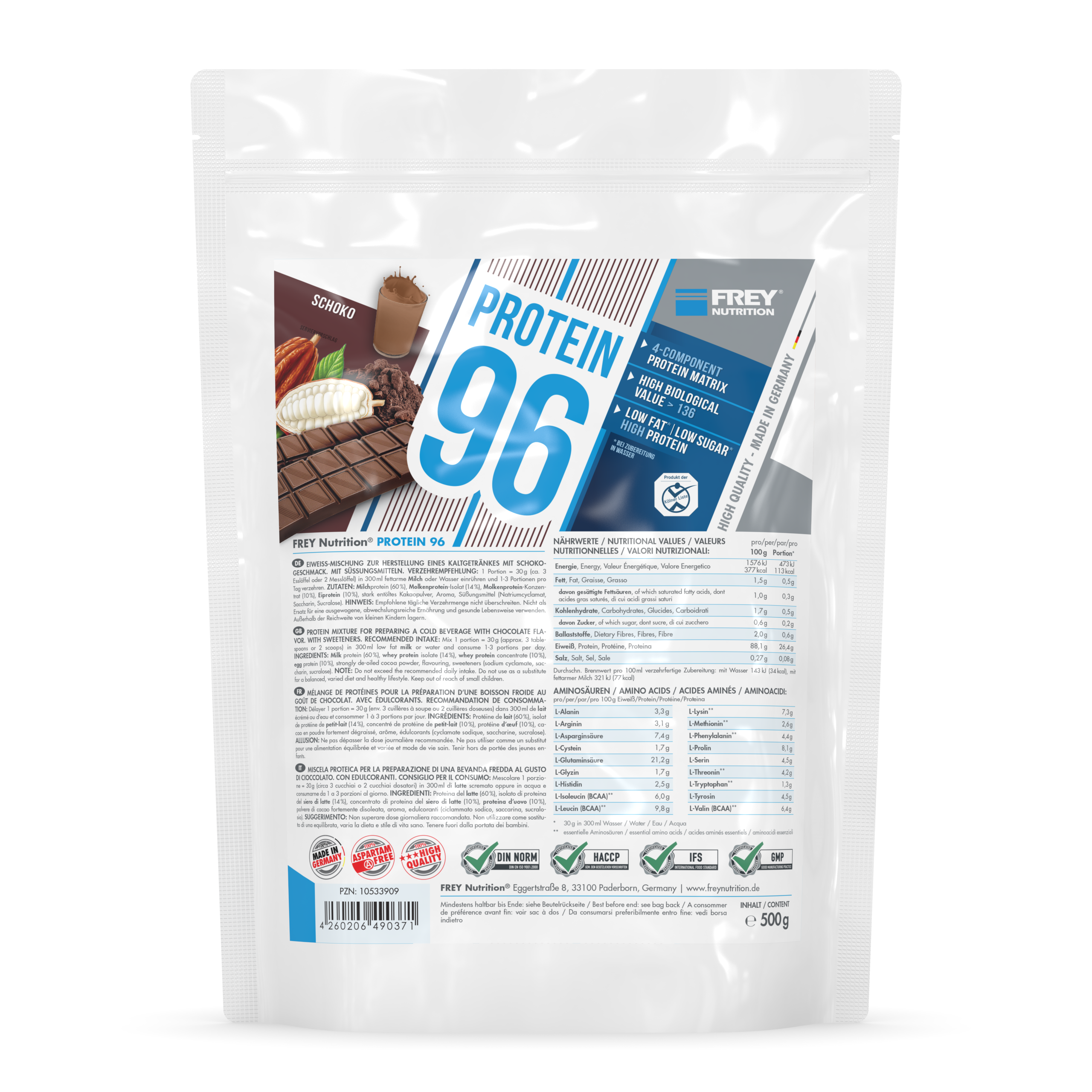 PROTEIN 96 ist ein 4-Komponenten-Protein der neuesten Generation. Durch die verschiedenen Proteinkomponenten (Milchprotein, Molkenprotein-Isolat, Molkenprotein-Konzentrat und Eiprotein) erreicht es eine hohe biologische Wertigkeit von über 136. Der durchschnittliche Proteingehalt liegt bei 96 % (i. Tr.). Durch den hohen Proteinanteil trägt PROTEIN 96 zum Aufbau und Erhalt von Muskelmasse bei und ist das ideale Protein für Diätphasen. Es schmeckt hervorragend mit Milch und auch mit Wasser - da es auf Wasserbasis entwickelt wurde - und lässt sich leicht (ohne Mixer) zubereiten.
