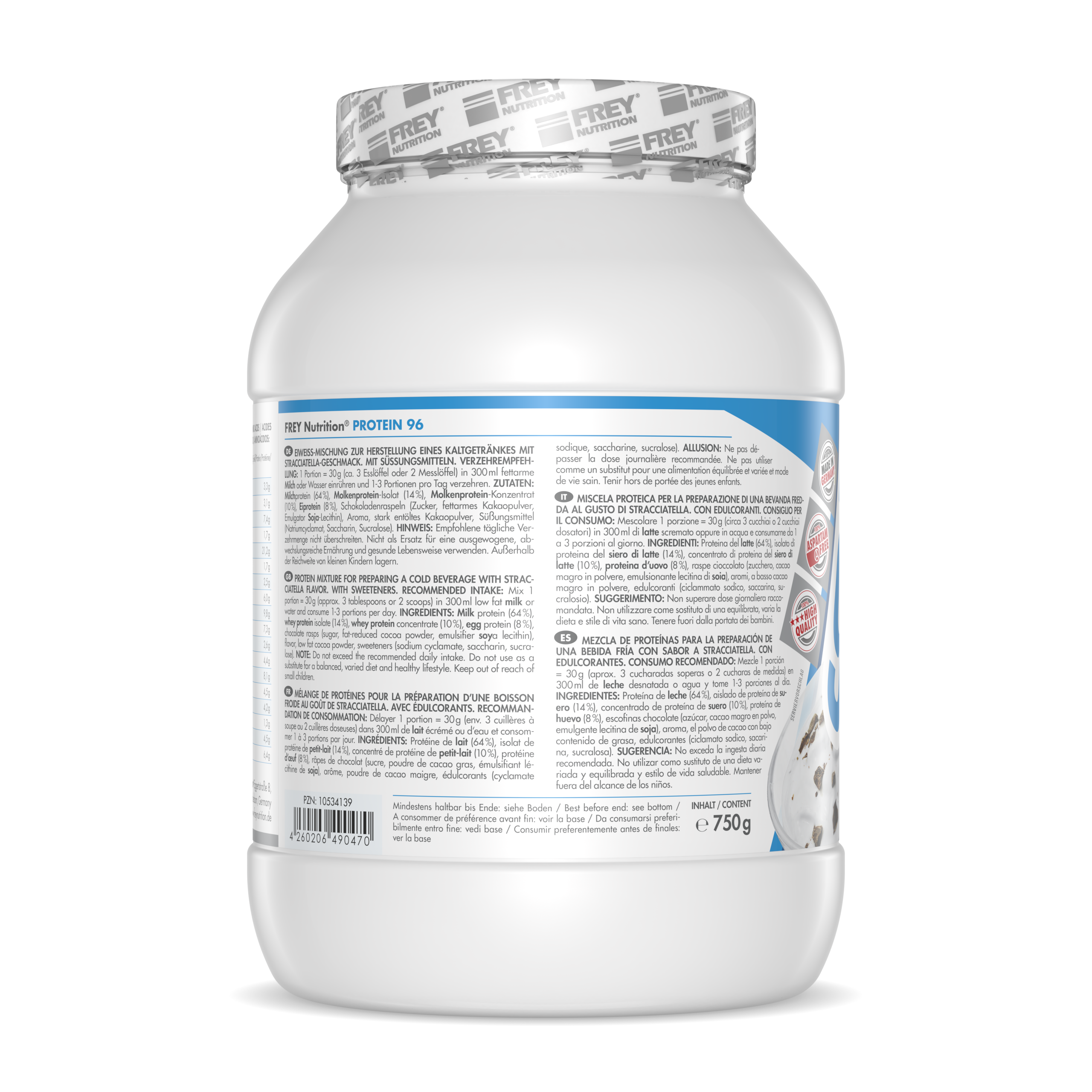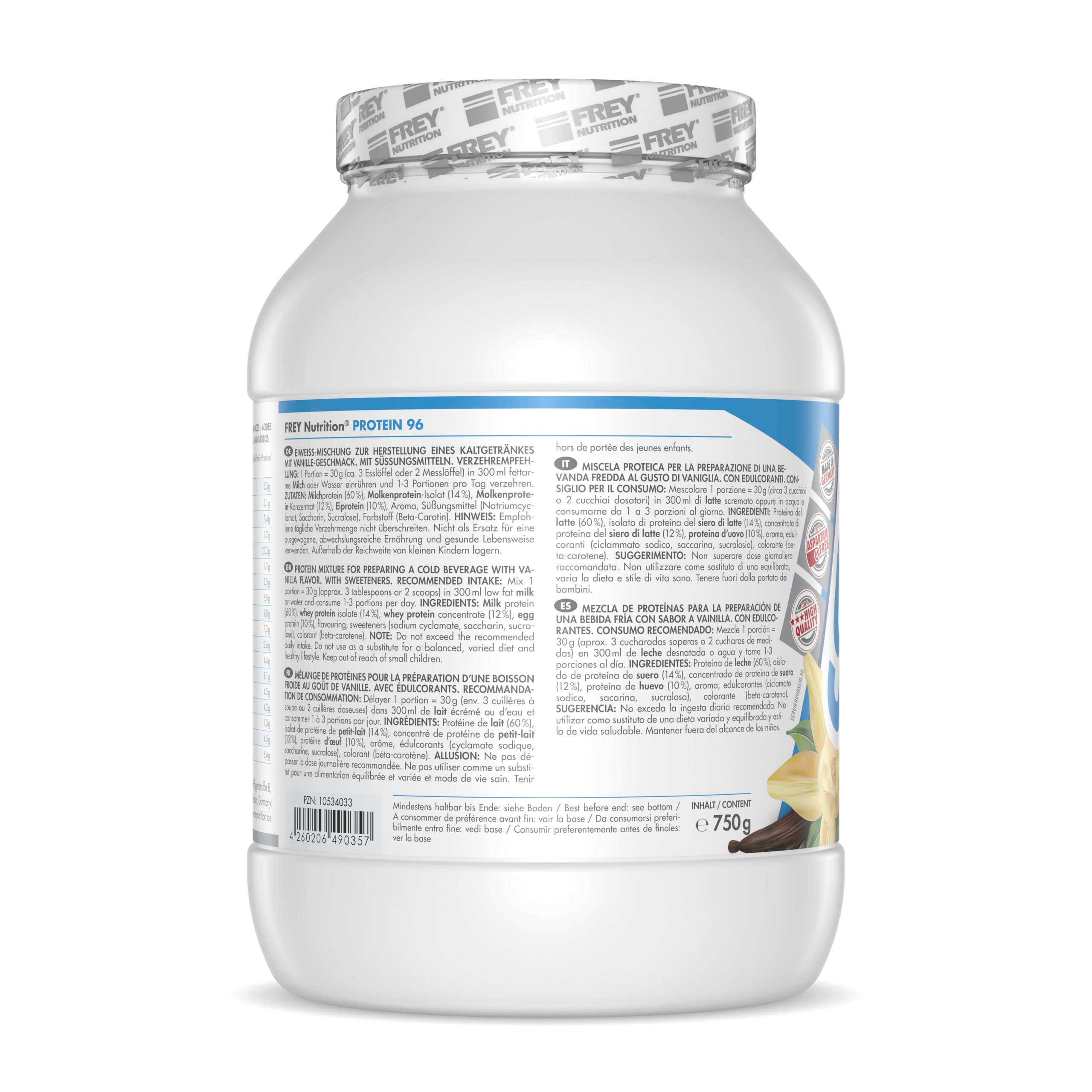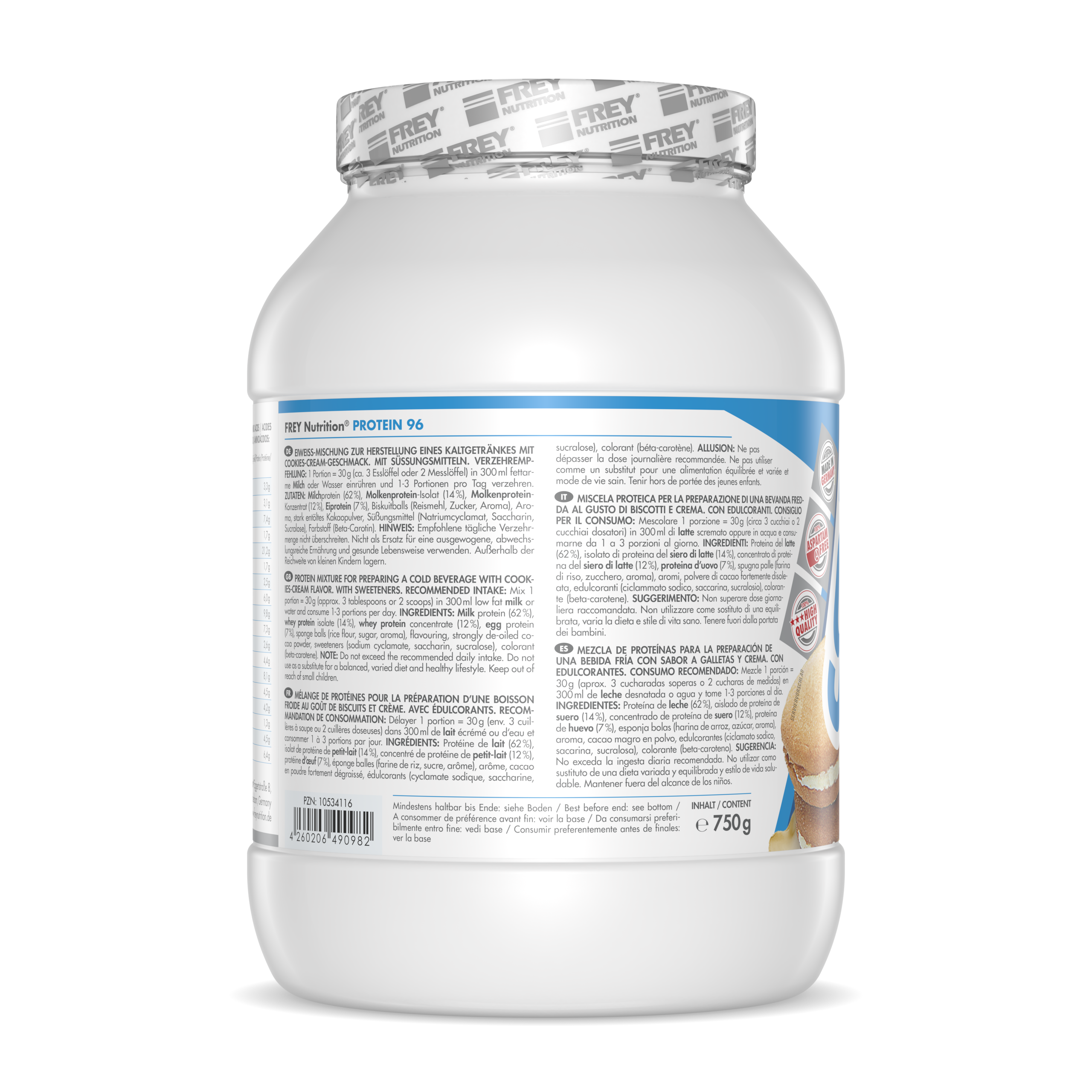 PROTEIN 96 ist ein 4-Komponenten-Protein der neuesten Generation. Durch die verschiedenen Proteinkomponenten (Milchprotein, Molkenprotein-Isolat, Molkenprotein-Konzentrat und Eiprotein) erreicht es eine hohe biologische Wertigkeit von über 136. Der durchschnittliche Proteingehalt liegt bei 96 % (i. Tr.). Durch den hohen Proteinanteil trägt PROTEIN 96 zum Aufbau und Erhalt von Muskelmasse bei und ist das ideale Protein für Diätphasen. Es schmeckt hervorragend mit Milch und auch mit Wasser - da es auf Wasserbasis entwickelt wurde - und lässt sich leicht (ohne Mixer) zubereiten.
